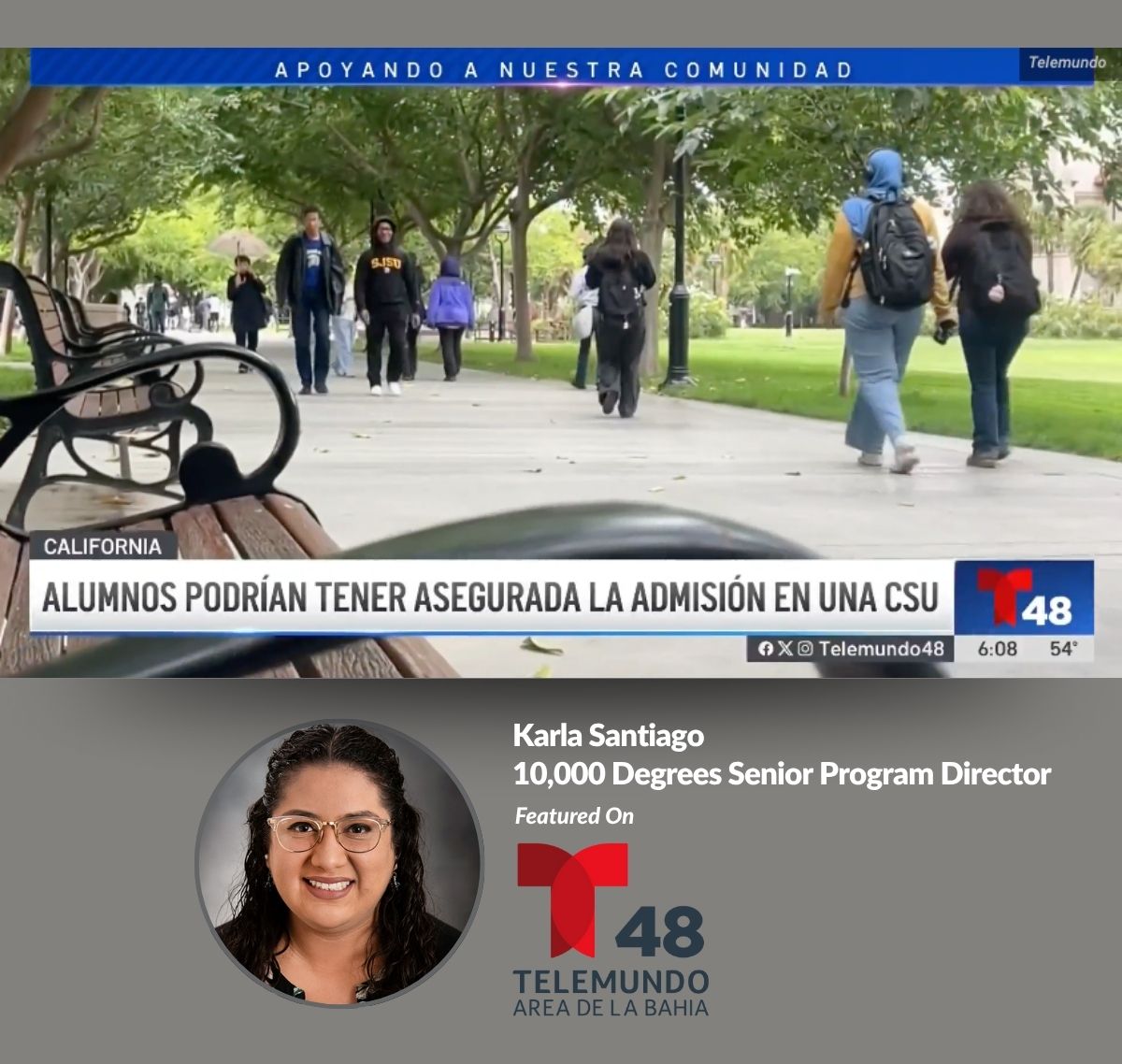10,000 Degrees Senior Program Director, Karla Santiago, was featured on Telemundo Bay Area sharing insights on a new California law granting high school students automatic admission to a CSU.